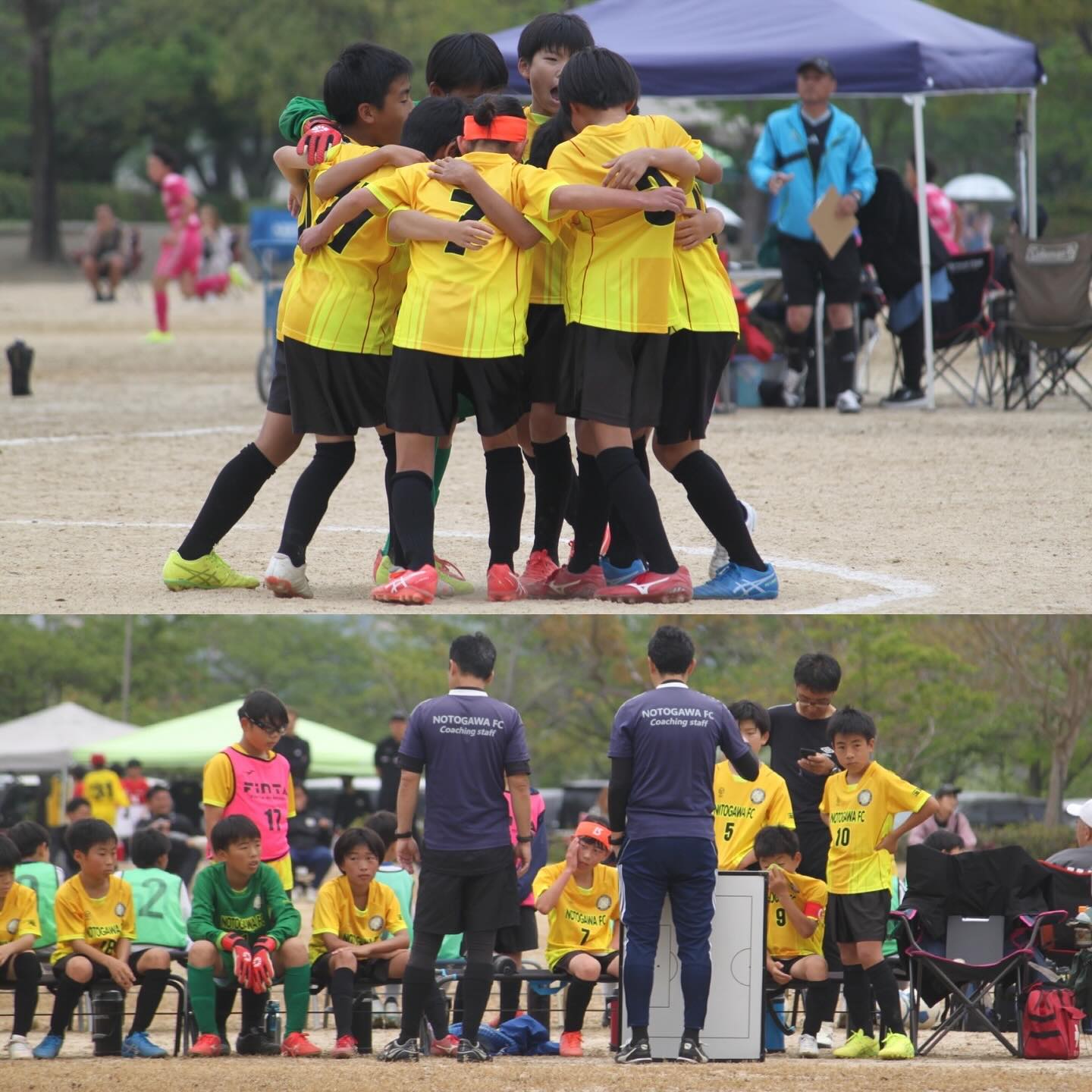 能登川FC U-12 × 2チーム U-12選手権大会予選にチャレンジしています⚽️ 能登川メテオ 1次予選1位通過 能登川ステラ 1次予選最終日の試合で勝利必要 公式戦の時の選手の団結力、集中力には脱帽 メテオとステラの盛り上げ方はそれぞれ違うけど、 キャプテンがいい味出してる(^^) キャプテンとはどんな役割か、、、 ラインコントロールやポジション修正の指示する人 試合の流れを変えるための声かけをする人 自分のプレーで流れを変えようとがんばる人 一人一人に声かけしてチームメンバーを気遣う人 キャプテンといっても、自分の強みを活かして 一人一人違っていいと思っています。 大事なことはひとつ。 決して最後まで諦めないこと。 これだけは、やり方が違っても、 能登川FCのキャプテン、副キャプテンか共通して持って